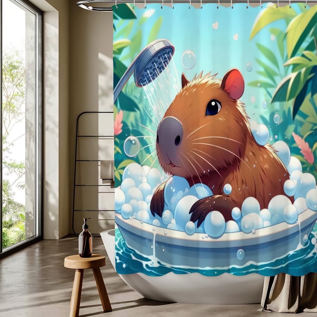 Capybara Cartoon Pattern Digital Print Shower Curtain - Machine Washable, Reversible Polyester, All-Season Bathroom/Home Decor