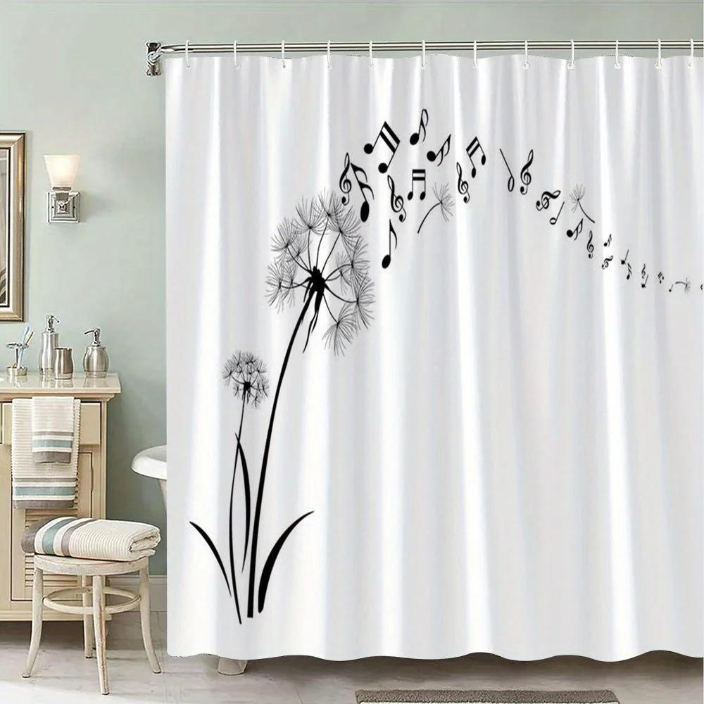 Dandelion & Music Notes Curtain - Rustic Wood Design, Textured Polyester, 70In, 12 Hooks, Machine Washable