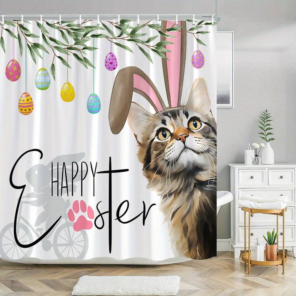 Easter Cat Eggs Shower Curtain Whimsical Tabby Bunny Ears Design Polyester Bath Decor with 12 Hooks Funny Easter Decor
