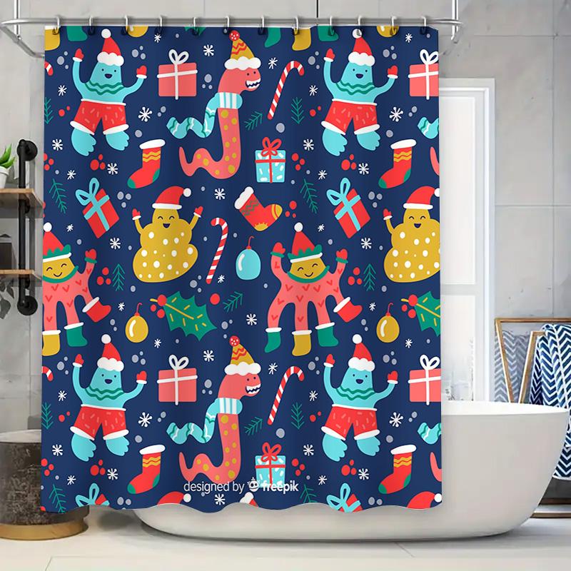 Christmas-themed shower curtain featuring colorful monster designs, perfect for festive home decor during holiday season