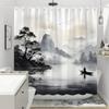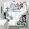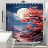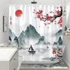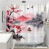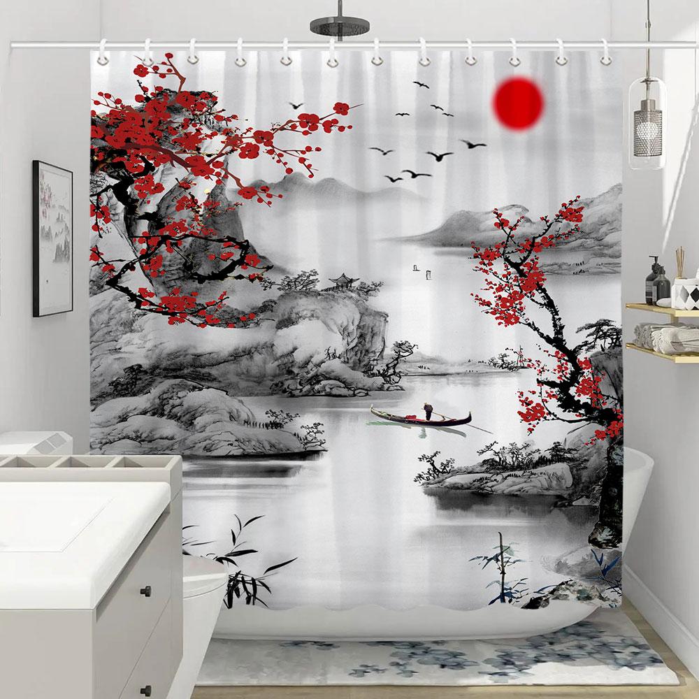 Shower Curtain Red Plum Blossom Branch Japanese Chinese Oriental Sun Misty Mountains Ink Nature Landscape Bathroom Curtains