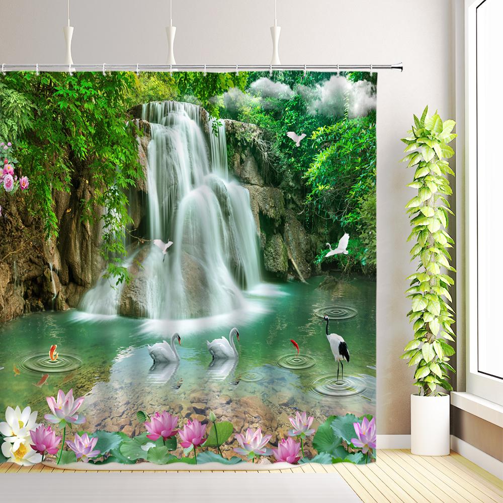 Forest Waterfall Nature Scenery Shower Curtain Flowers Green Plant Trees Birds Animals Home Decor Bathroom Curtains With Hooks