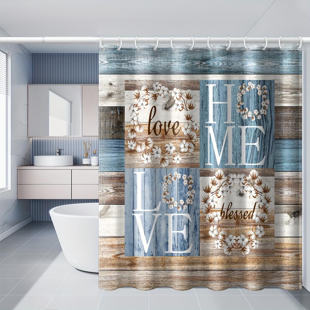 Blue and Brown Wooden Plank Home Pattern Shower Curtain with 12 Hooks, Floral Print Decor Bathroom
