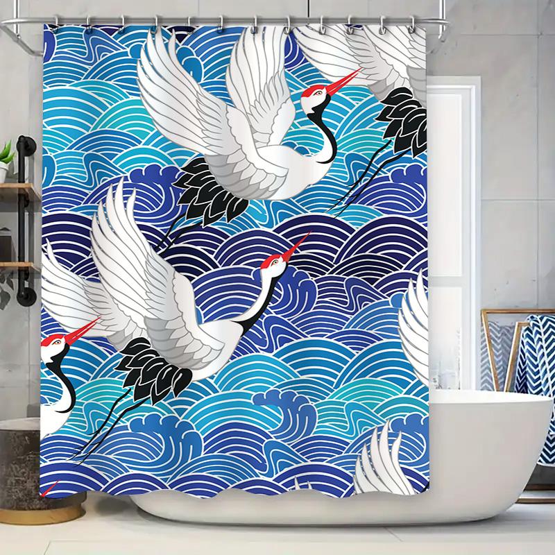 Blue Waves White Cranes Shower Curtain: Unique Home Decor for Bathrooms Printed Fabric Waterproof Hanging Decorations (Size XXL)