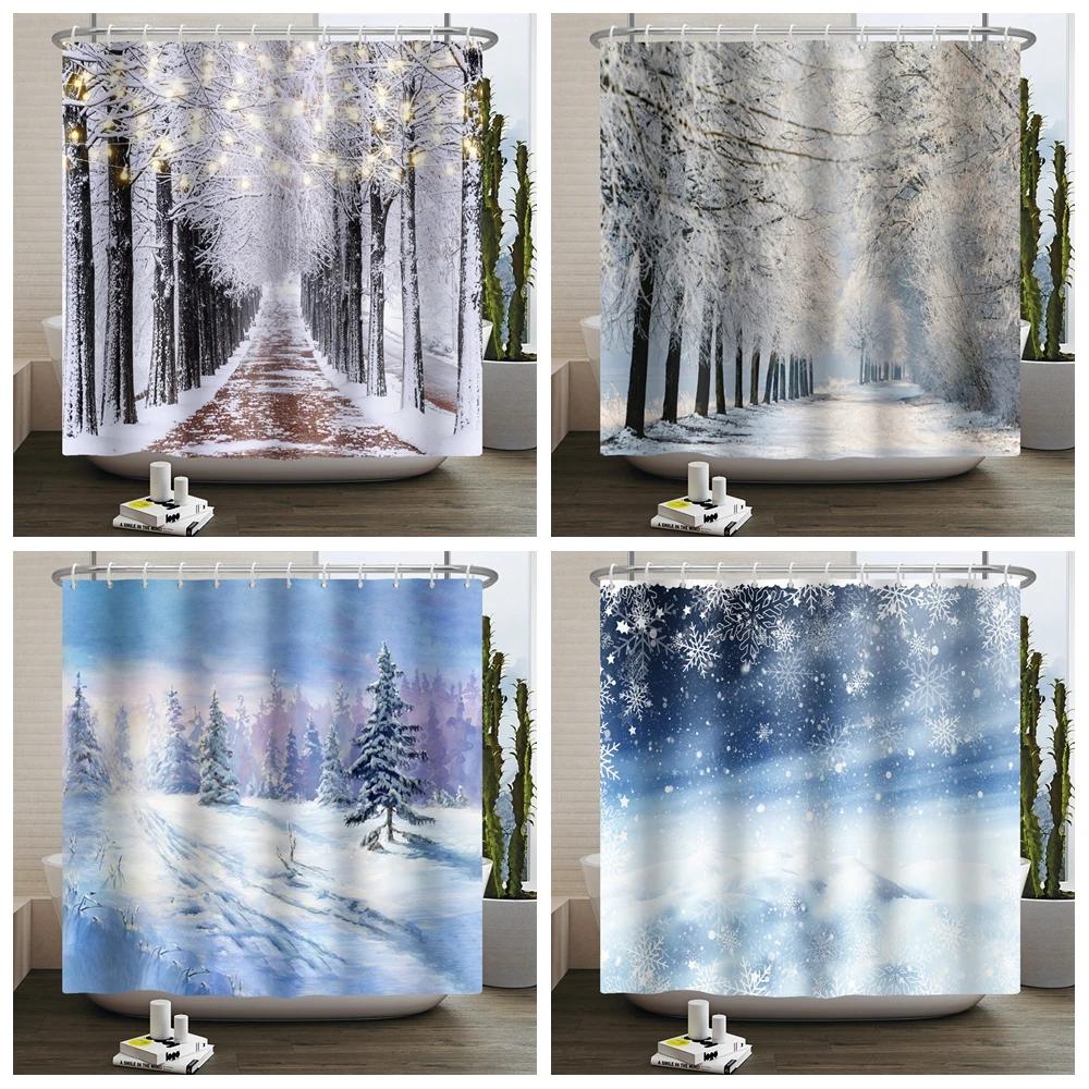 Winter Christmas Shower Curtains Natural Forest Snow Landscape Home Bathroom Curtain Waterproof Washable Bathtub Screen Decor