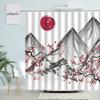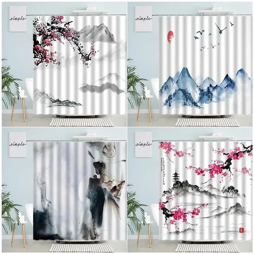 Chinese Ink Landscape Shower Curtain Japanese Cherry Blossom Watercolor Mountain Natural Scenery Waterproof Cloth Bathroom Decor