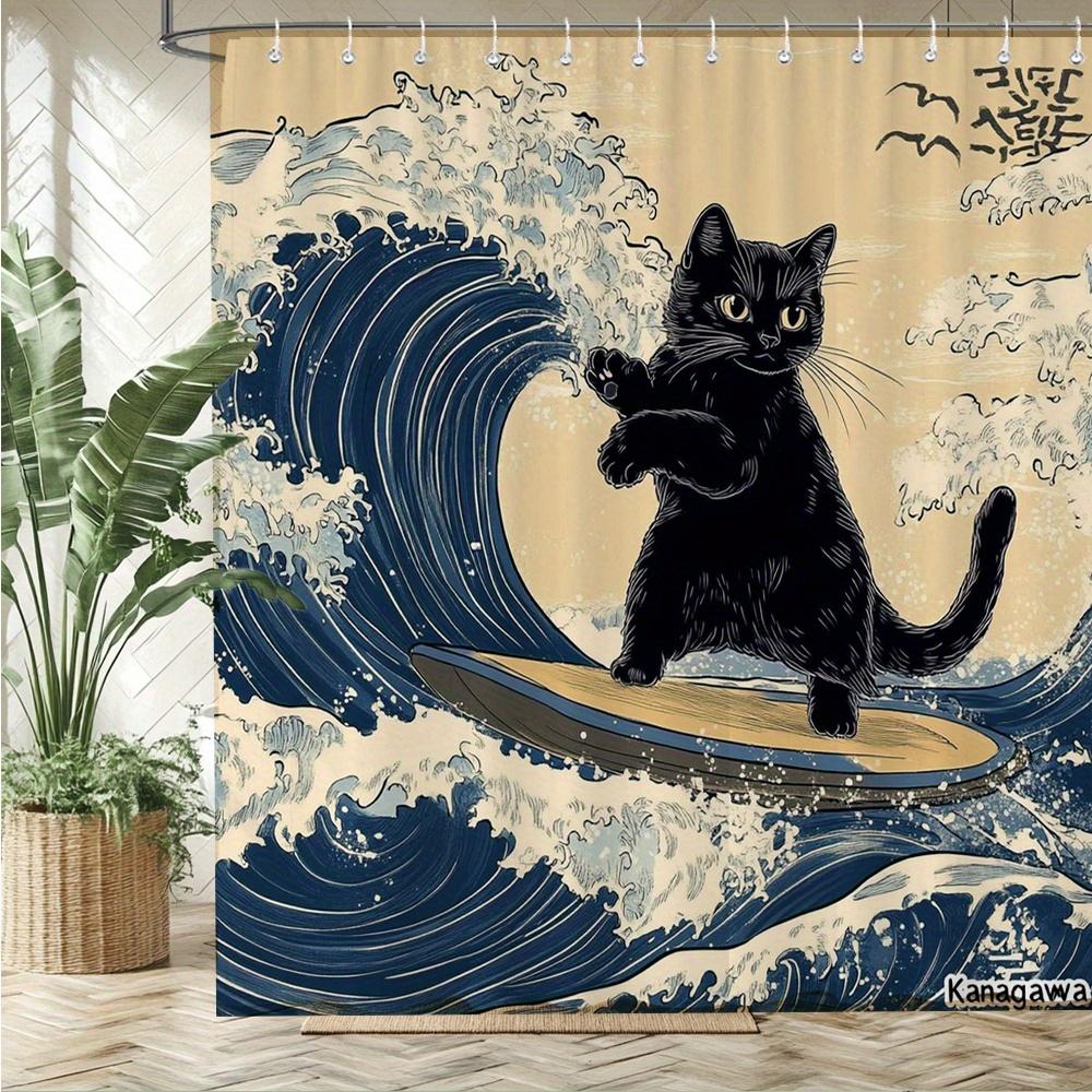 Cat Surfing Shower Curtain Great Wave Design Japanese Art Bathroom Decor Waterproof Curtains Anime Home Style