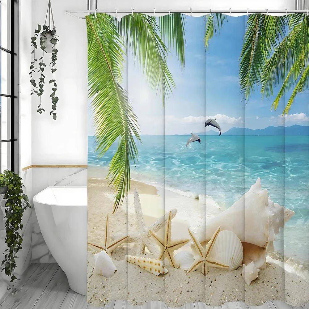 Zasłona prysznicowa Muszla rozgwiazdy, Ocean Plaża Wyspa Palma Delfin Muszla rozgwiazdy Dekoracyjna zasłona prysznicowa do łazienki, Wodoodporna