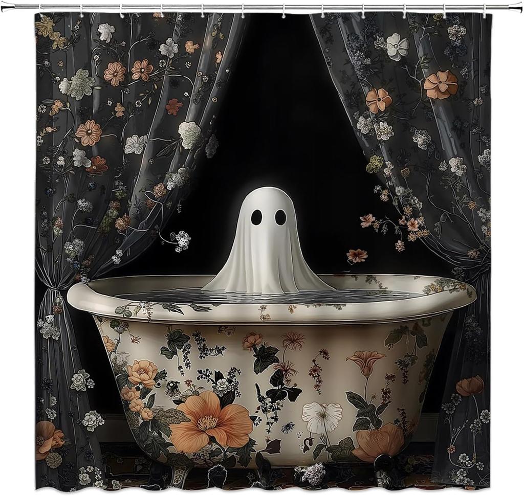 Funny Ghost Shower Curtain Halloween Spooky Gothic Retro Floral Scary Horror Vintage Fabric Decorative Bathroom Curtains Hooks