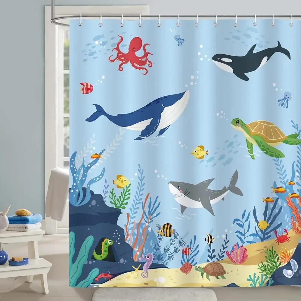 Zasłona prysznicowa Ocean dla dzieci Podwodny Delfin Ryba Niebieska Dekoracyjna Zasłona Kąpielowa Tkanina Poliestrowa Zmywalna Zasłona Łazienkowa