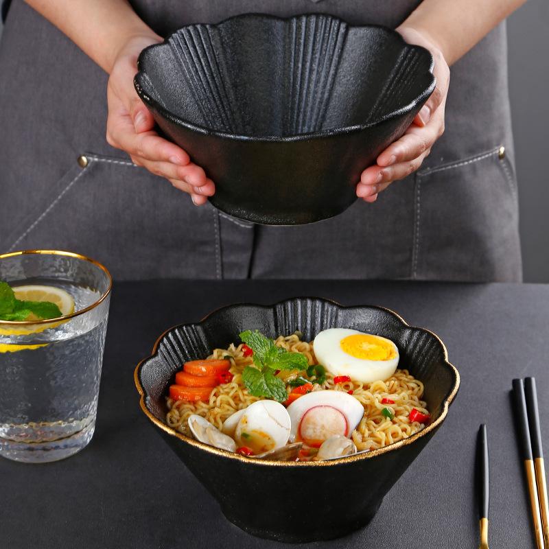 Japanese Matte Hat Bowl Household Rice Bowl Soup Bowl Black Underglaze Color Noodle Bowl Gold Edge Petal Ceramic Bowl