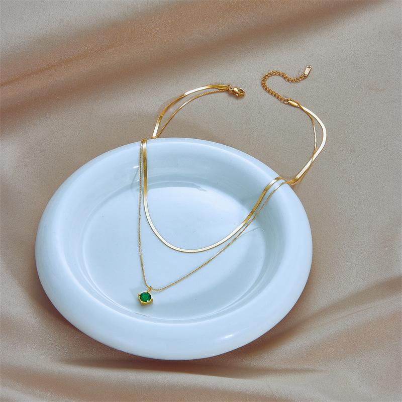 Gold Plated Double Layer Necklace with Herringbone Chain Green Zircon Pendant, Vintage Emerald Charm Chain for Women