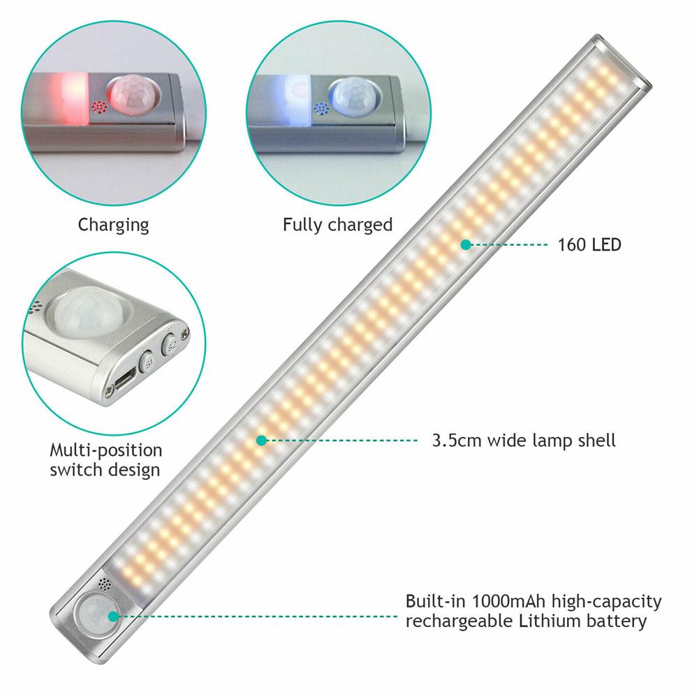 3 Color Modes Are Brighter and Visually Friendly Whether you need more light in your kitchen, closet, over worktop or computer desk, under cabinet lights are your choice. nbsp 4 Cycle Modes: Always On Mode: The light will be on for 5 hours after fully charged. Motion sensor mode green light flashes for 1s : The LED sensor cabinet light can detect movement within a range of 26 feet, with an angle of 120 deg , and turns off when it is not detected after 20 seconds. Night sensor mode red light flashes for 1s : Only when the light sensor detects darkness, the closet light will turn on Turn off nbsp Attach anywhere, 2 ways to install easily: 1. With built in magnet, the cabinet bottom light can be directly attached to the surface of iron products 2. With magnetic strips, it can be attached to the surface of any non ferrous products. You can always remove it if you need to recharge or change locations. nbsp Adjustable Brightness:Press the S1 key to adjust the brightness from 0.1 to 100 . Perfect for bedrooms, bathrooms, cupboards, closets, stairs, drawers, under cupboards, storage rooms, wardrobes, workshops, bookshelves, attics, closets, shoe cabinets, pedestals Description: Product