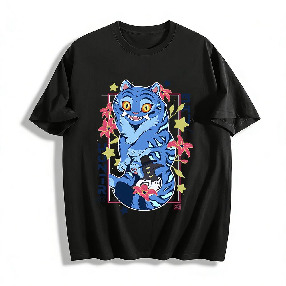 Cool Blue Tiger Print Short Sleeve T-Shirt Dark Style Animal Pattern Unisex Casual Top Pure cotton T-shirt