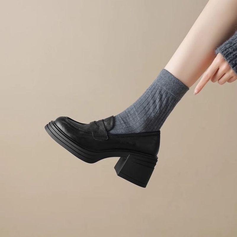 Mięciutki i mięciutki! 2025 jesień i zima nowe jednokolorowe okrągły nosek małe skórzane buty platforma wszechstronne buty na wysokim obcasie gruby obcas