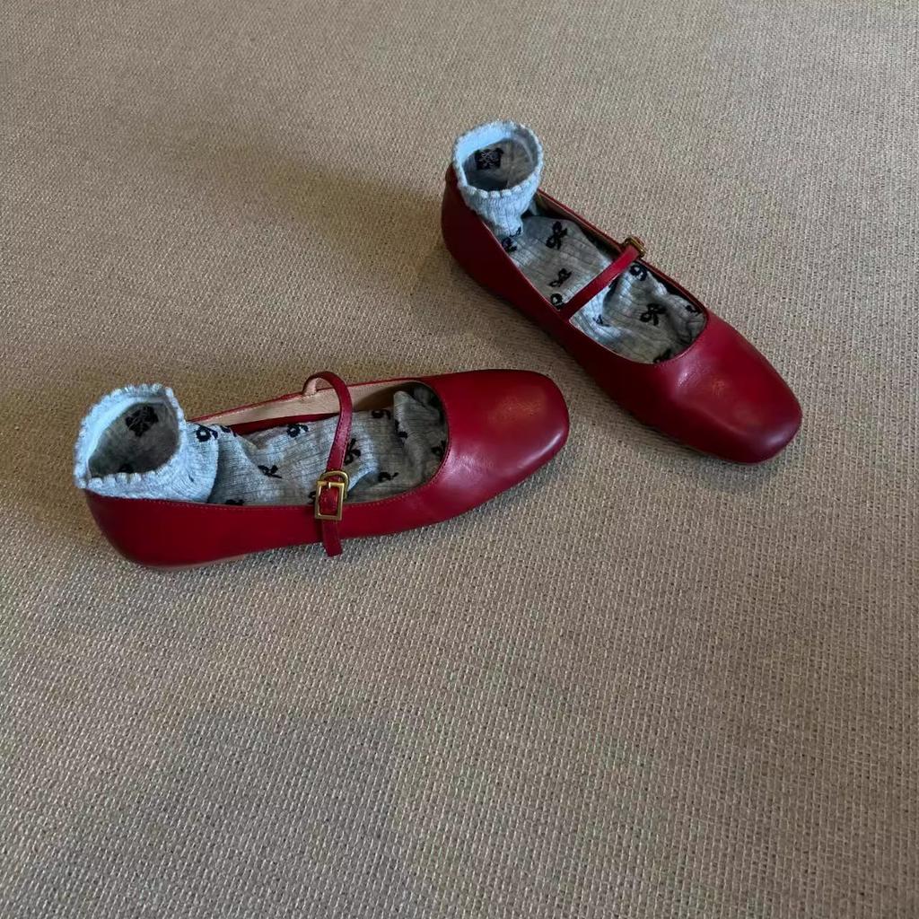 Koreańska córka styl retro okrągły nosek klamra na jeden pasek czerwone baletki Mary Jane buty na płasko do chodzenia