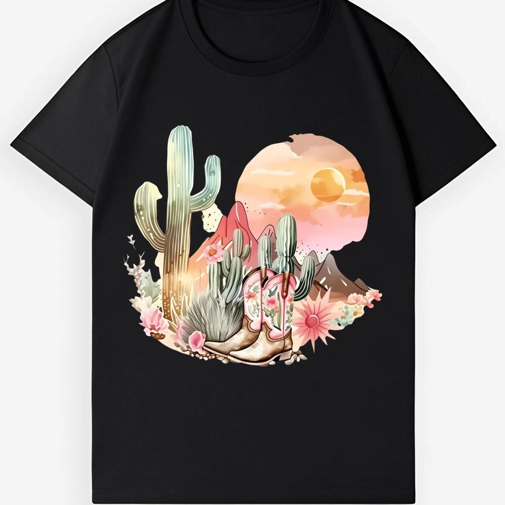 Southwestern Desert Cactus Cowboy Boots T-Shirt, Boho Sunset Graphic Tee