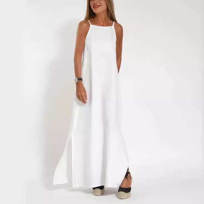 Modna casualowa sukienka kamizelkowa z bawełny i lnu z rozcięciem