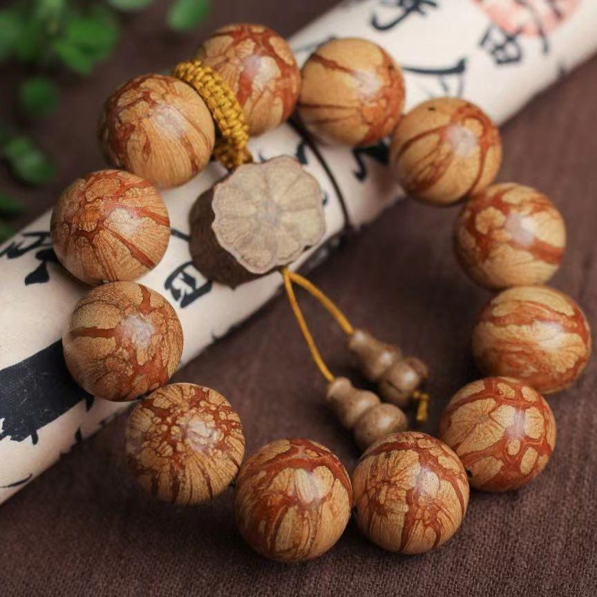 Plum Blossom Bone Inlay Prayer Beads Bracelet with Chen Mei Hua Wood and Six Paths Wood Grain