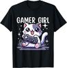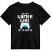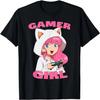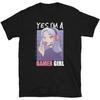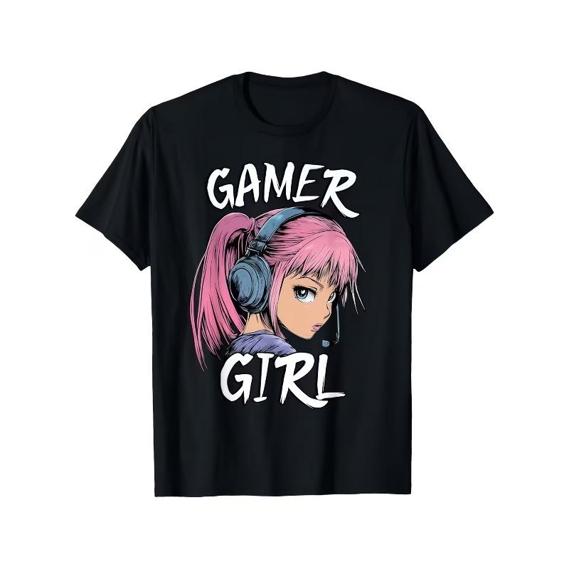 European sizes Girl Gamer Pattern T-Shirt - Black Casual Short Sleeve Crew Neck Pink Headset Handle Design