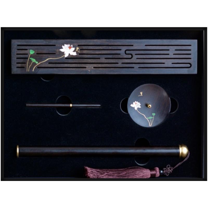 Lotus Rhyme Purple Black Sandalwood Incense Holder Gift Set - Four-Piece Wooden Business Ceremony Souvenir.
