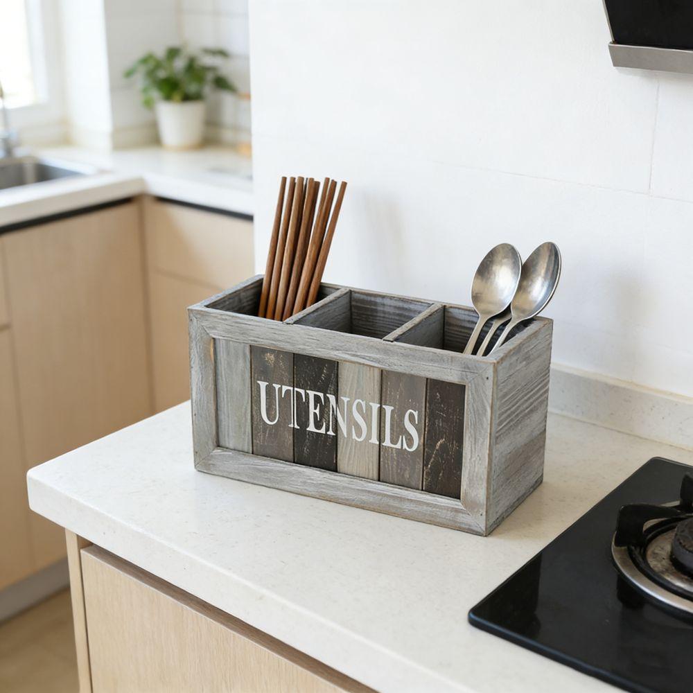 3 Grids Tableware Storage Box Vintage with Divider Solid Wood Storage Box Large Capacity Chopstick Fork Spoon Organizer