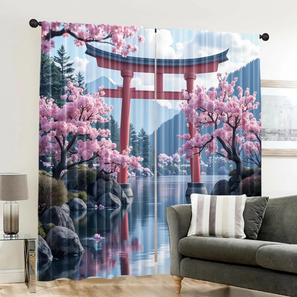 Set Of 2 Jit Cherry Blossom Pastoral Curtain Japanese Scenery Design Polyester Spring Window Decor Home With Light Blocking