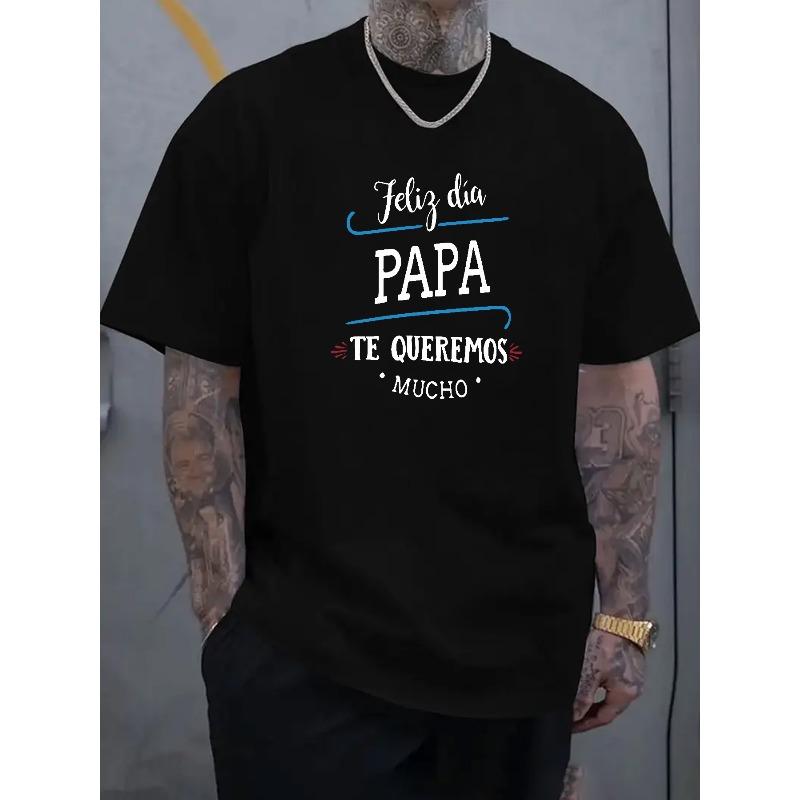 European sizes Men'S Casual Summer T-Shirt - "Feliz Día Papa, Te Queremos Mucho" Print, Short Sleeve, Round Neck, Knit Fabric
