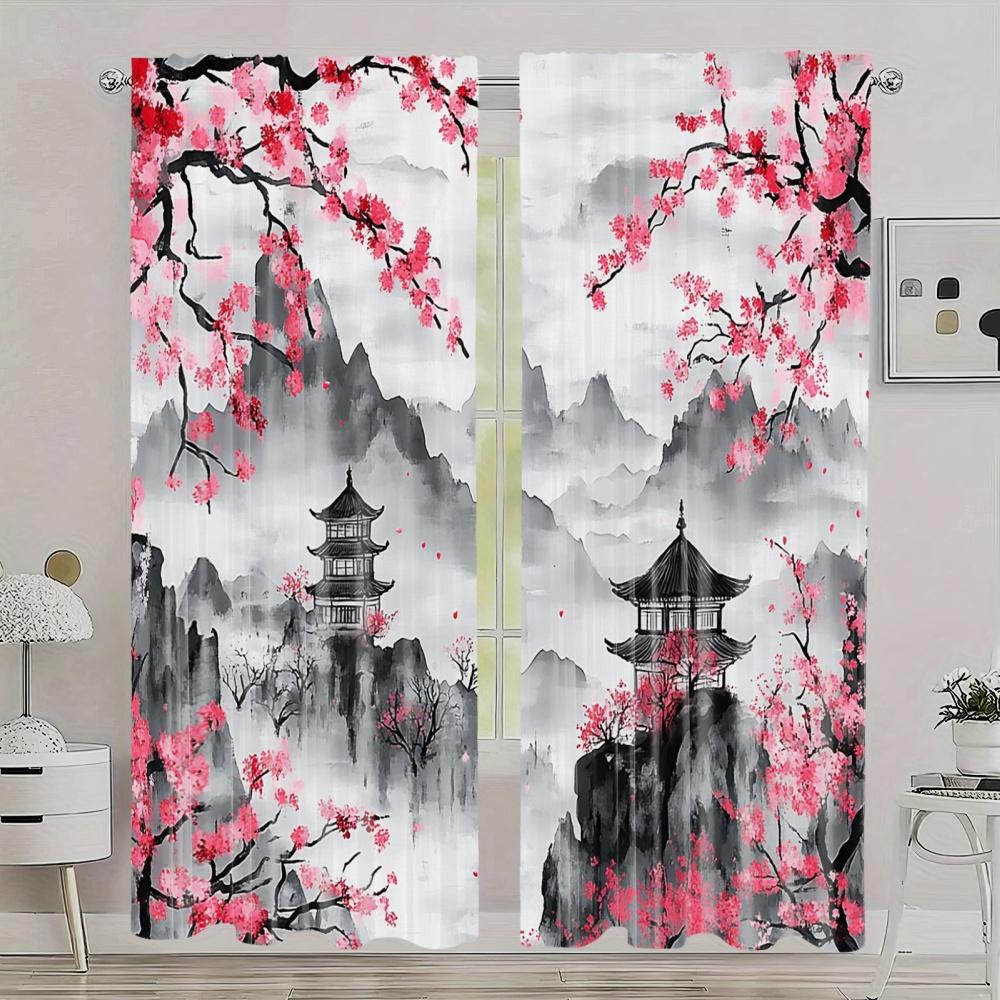 Chinese Ink Painting Sakura Curtains Top Bedroom Living Room Light Blocking Set Of 2 Made Polyester With Rod Pocket Great Decor