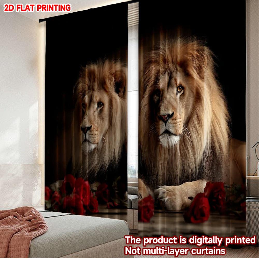 Set Of 2 Lion Red Roses Curtains Digital Printing Majestic Animal Portrait Dark Background Bedroom Living Room Decor Curtain Polyester Ideal For Great