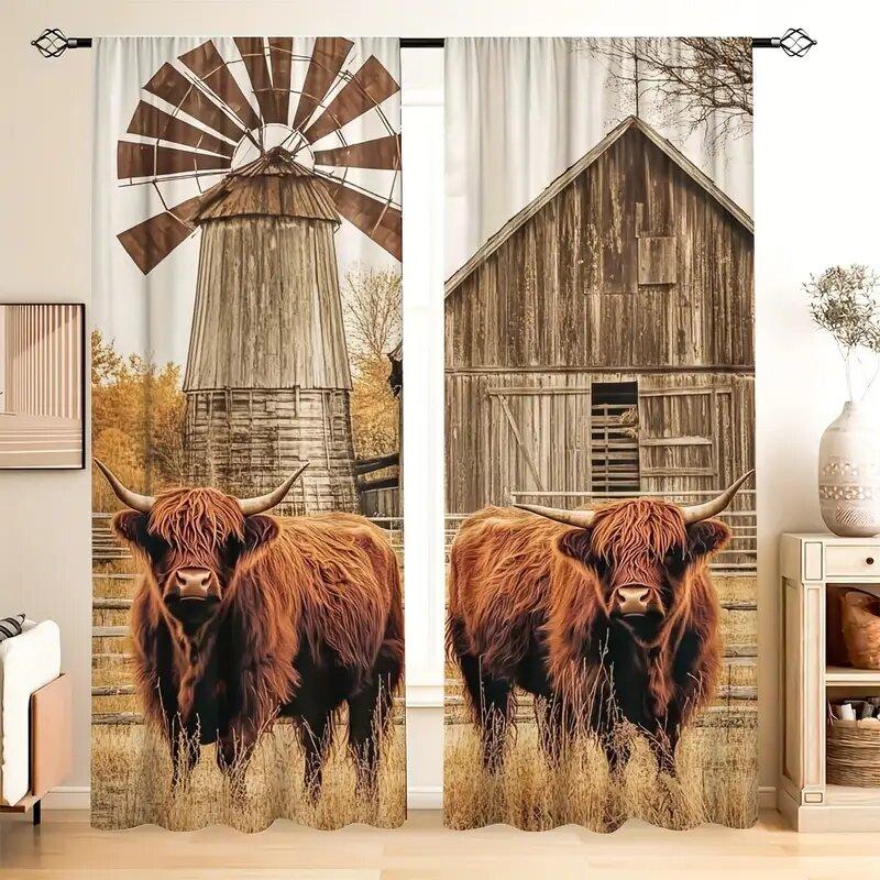 Set Of 2 Farmhouse Style Ox Pattern Printed Curtains Window Decoration Home Room Curtain Polyester