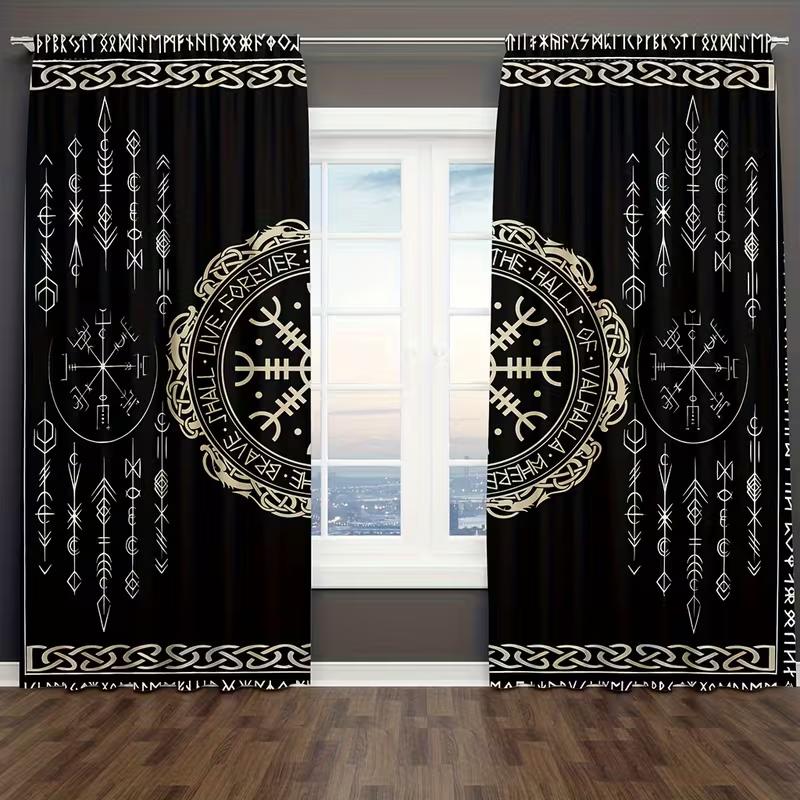 Vikama Norse Rune Viking Symbol Curtain Black Gold Celtic Knot Pattern Window Decor Panels Light Blocking Made Of Polyester
