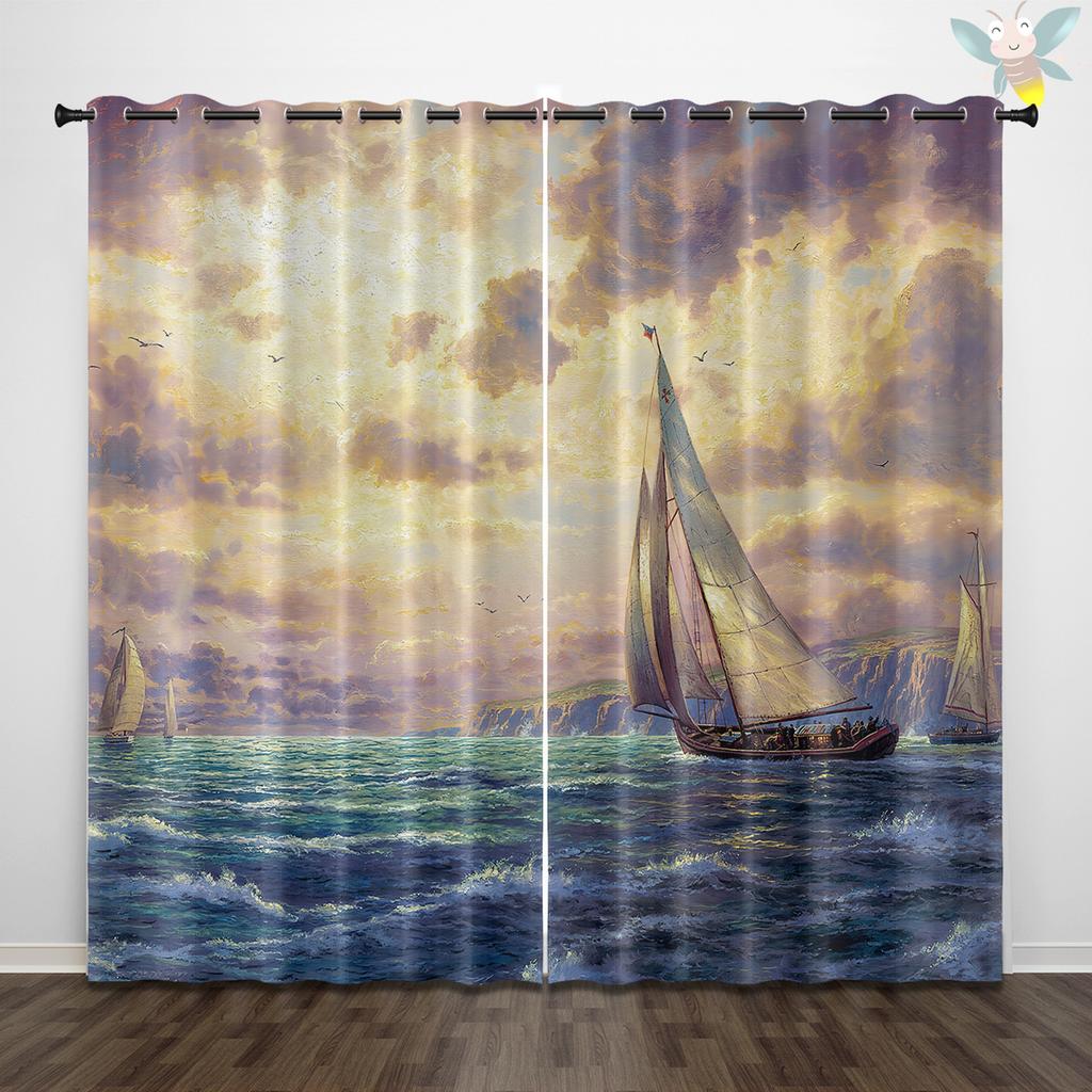 Set Of 2 Ocean Sailboat Pattern Printed Curtains Suitable Living Room Bedroom Office Sliding Window Home Decoration Made Polyester Great Treatment