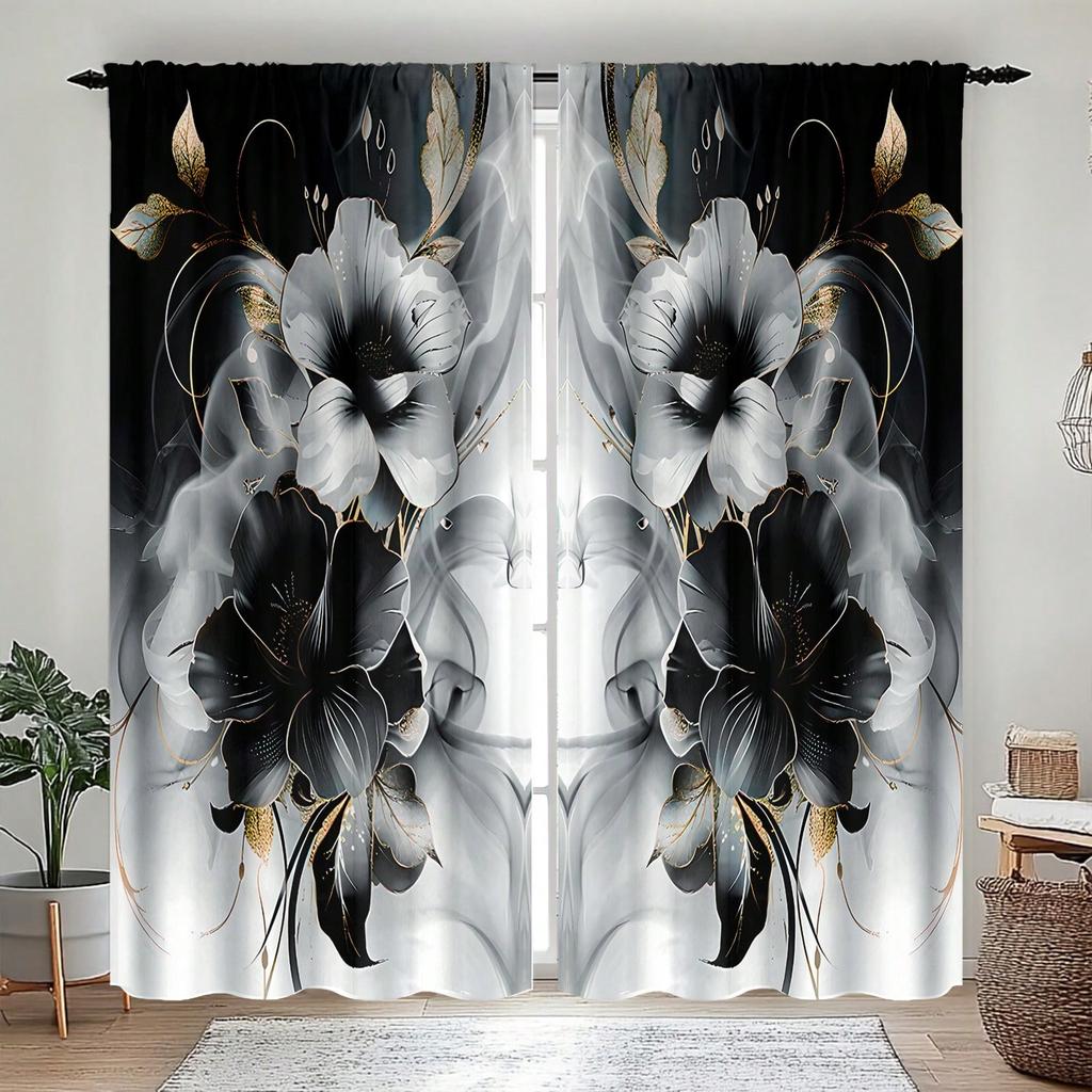 Set Of 2 Polyester Material Floral Watercolor Print Semi Curtains Golden Trim Suitable Bedroom Living Room Office Curtain With Light Filtering Perfect