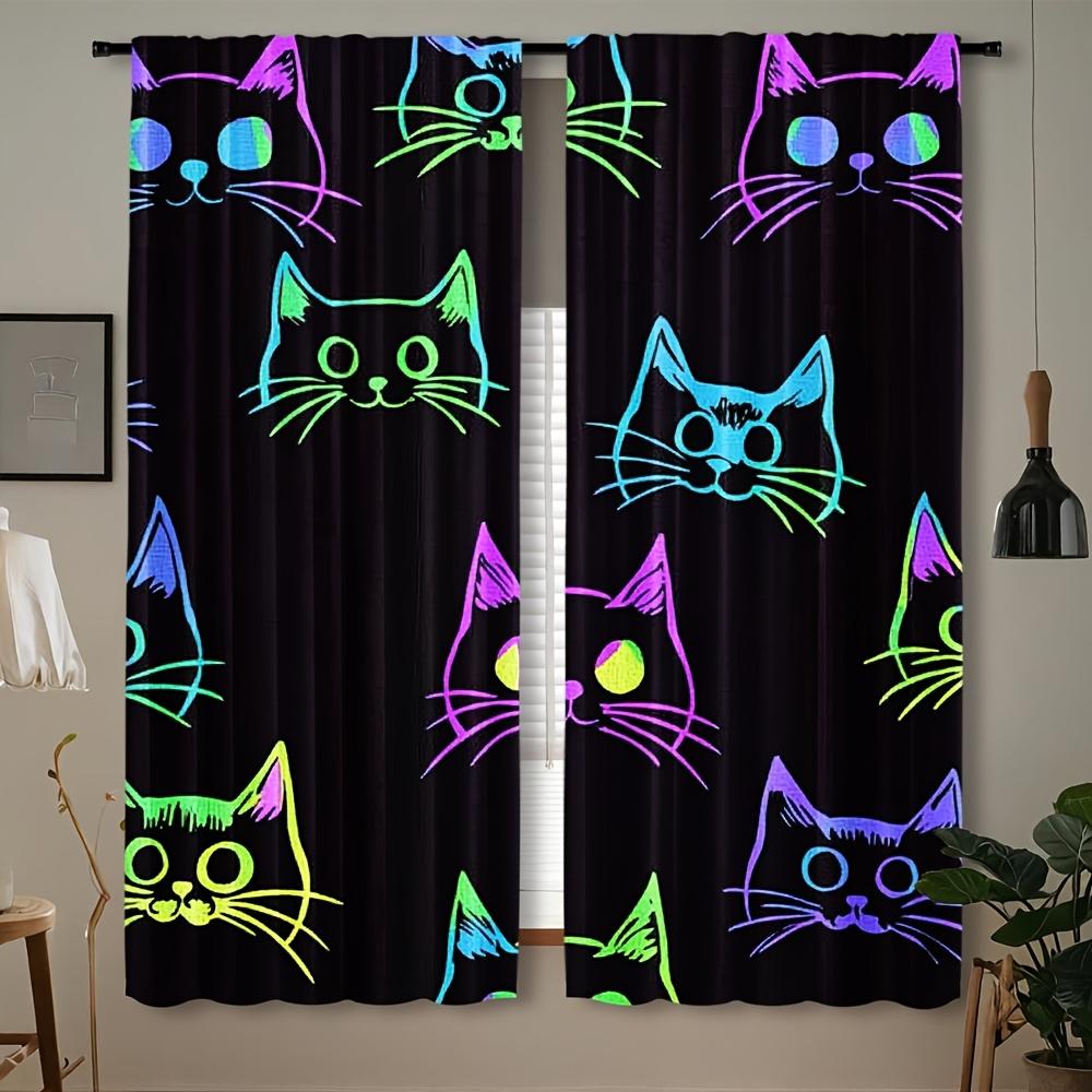 Set Of 2 Fluorescent Cat Print Curtains Installation Polyester Drapes Bedroom Living Room Curtain Sheer For Great Made With Rod Pocket