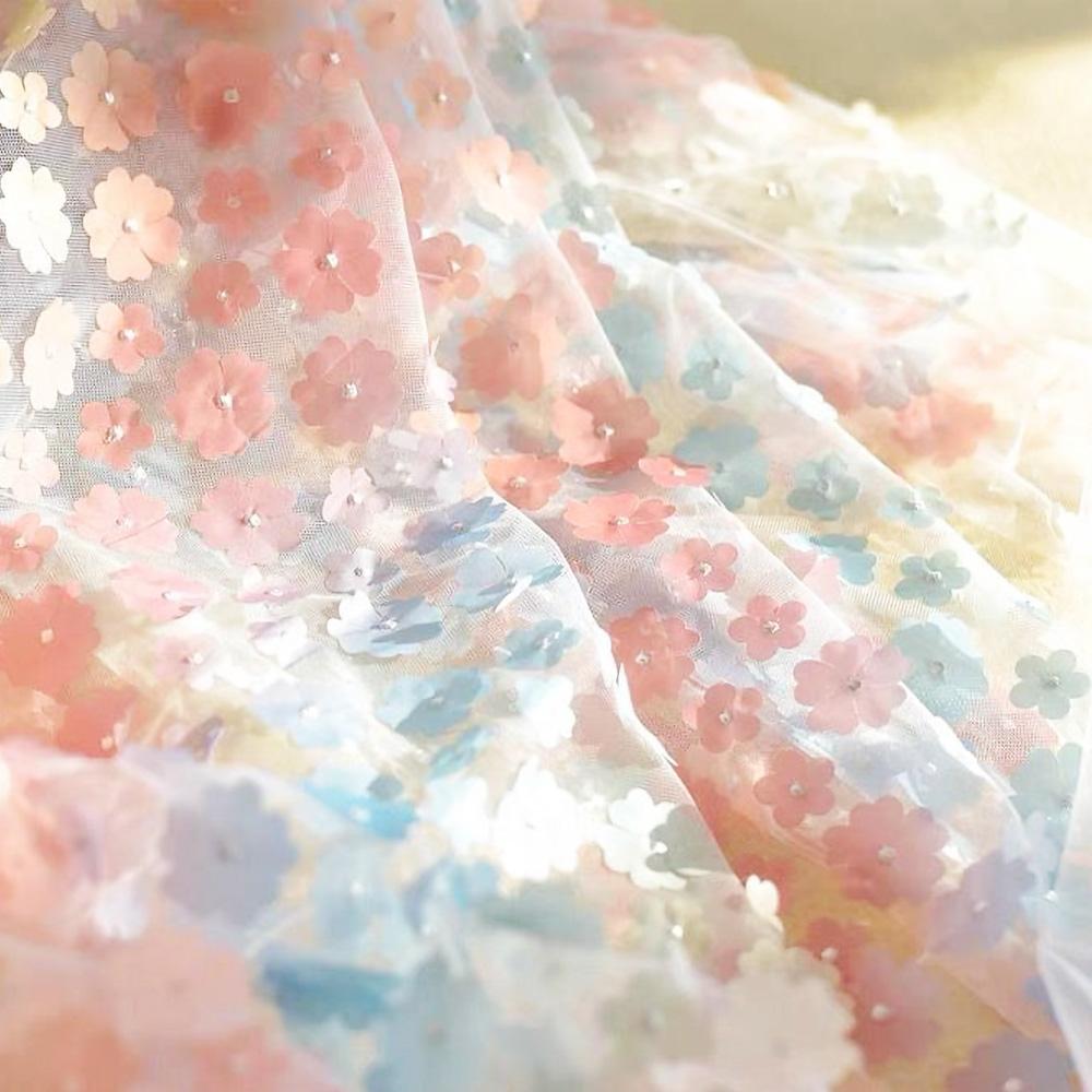 1Yard Rainbow Color 3D Bead Applique Gradient Flowers Mesh Lace Fabric For Girls Summer Clothing Princess Dress Sewing Materials