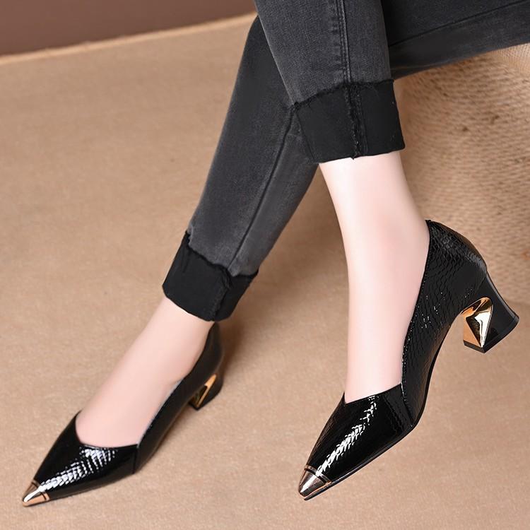 Metal pointed head shallow mouth single shoes women's spring and autumn new French thick heel versatile comfortable medium heel small leather shoes