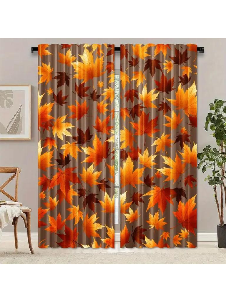 Set Of 2 Vibrant Autumn Leaf Printed Curtains Designed Quality Material Ideal Fall Themed Home Window Dec Curtain Sheer Polyester