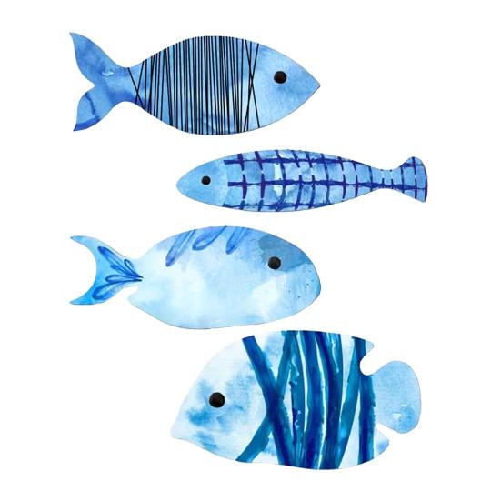 Vibrant Watercolor Design: Painted in soothing shades of blue, these fish graphics capture the serene colors of the ocean. The watercolor technique adds a soft, artistic touch that brightens walls without overwhelming them. This color palette promotes relaxation and complements various interior styles focused on natural and marine elements.