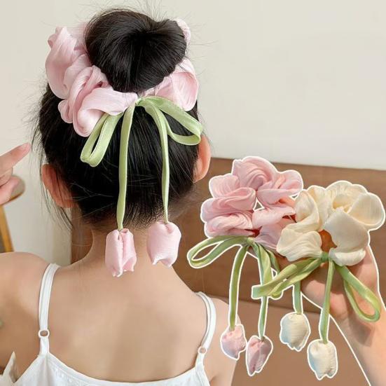 Hair Tie Breathable Chiffon Organza Fabric High Elasticity Tulip Flower Design Hair Rope with Ribbon Streamers Ponytail Bun Hair Accessories