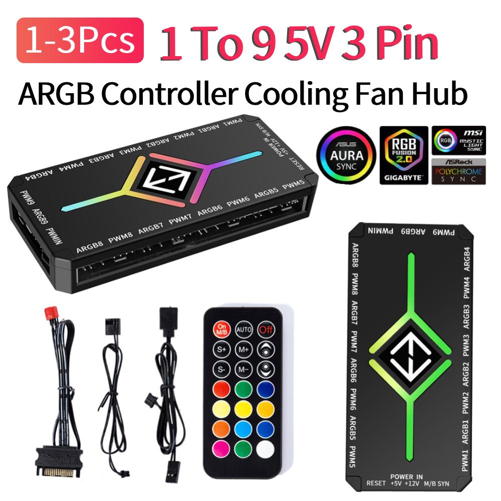 1/2/3 Pcs 1 To 9 3 in 1 5V 3 Pin ARGB Controller Cooling Fan Hub with Remote 4 Pin PWM Magnetic Suction Hub SATA Power Supply