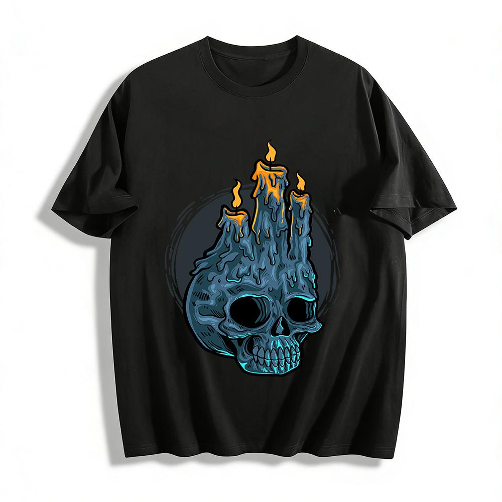Dark Style Skull Candle Print Trendy Street Casual Crewneck Top Pure cotton T-shirt