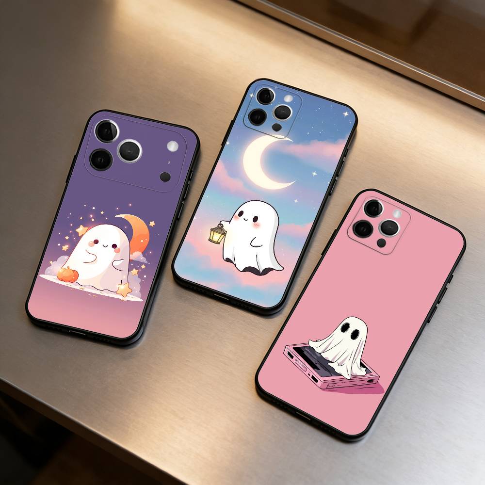 C-Cute Ghost Halloween Phone Case For iPhone 17,16,15,14,13,12,11 Plus,Pro Max,Soft Silicone Black Cover