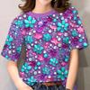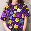 Women's summer 3D floral T-shirt with purple floral print casual short sleeved T-shirt