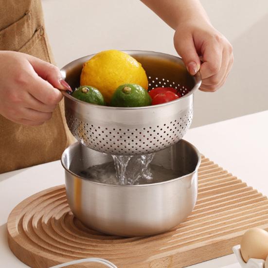 This versatile washing basin features a space-saving nested design, allowing easy stacking and storage in kitchen cabinets to keep your space tidy and clutter-free. Made from food-grade stainless steel, it ensures durability, corrosion resistance, and odor-free use, making it safe and hygienic for everyday kitchen tasks. Combining a drain basket and cooking basin in one, it serves multiple purposes—from washing vegetables and rice to beating eggs and cooking meals. The fine drain holes efficiently control water flow, quickly draining without trapping food particles for hassle-free cleaning. Its flat-bottom design is compatible with induction cookers and open flames, perfect for cooking noodles, soups, and more.