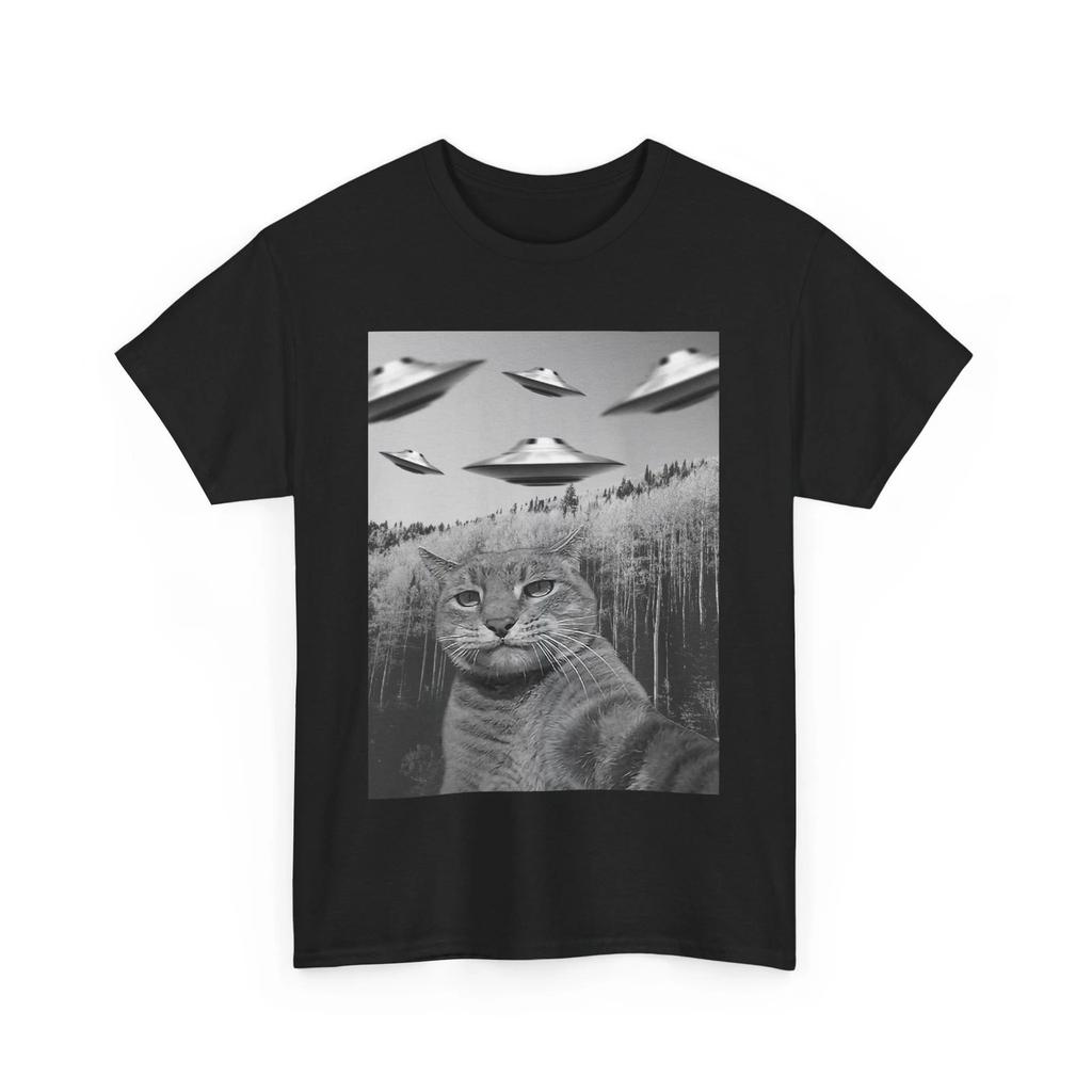 Cat Selfie with UFOs T shirt, Space Cats Lovers Flying Saucers Women Men T shirt