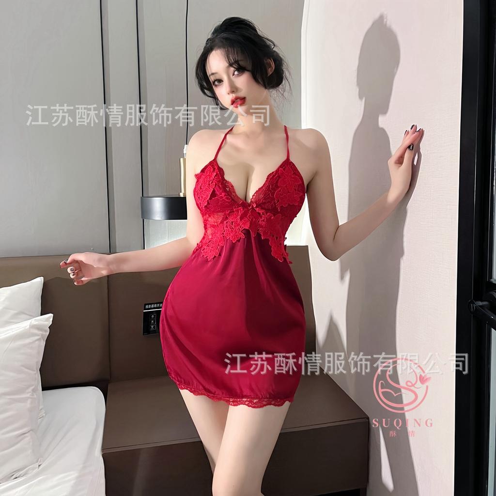 Suspender nightdress sexy backless new model with chest pad ice silk lace solid color pure desire wind