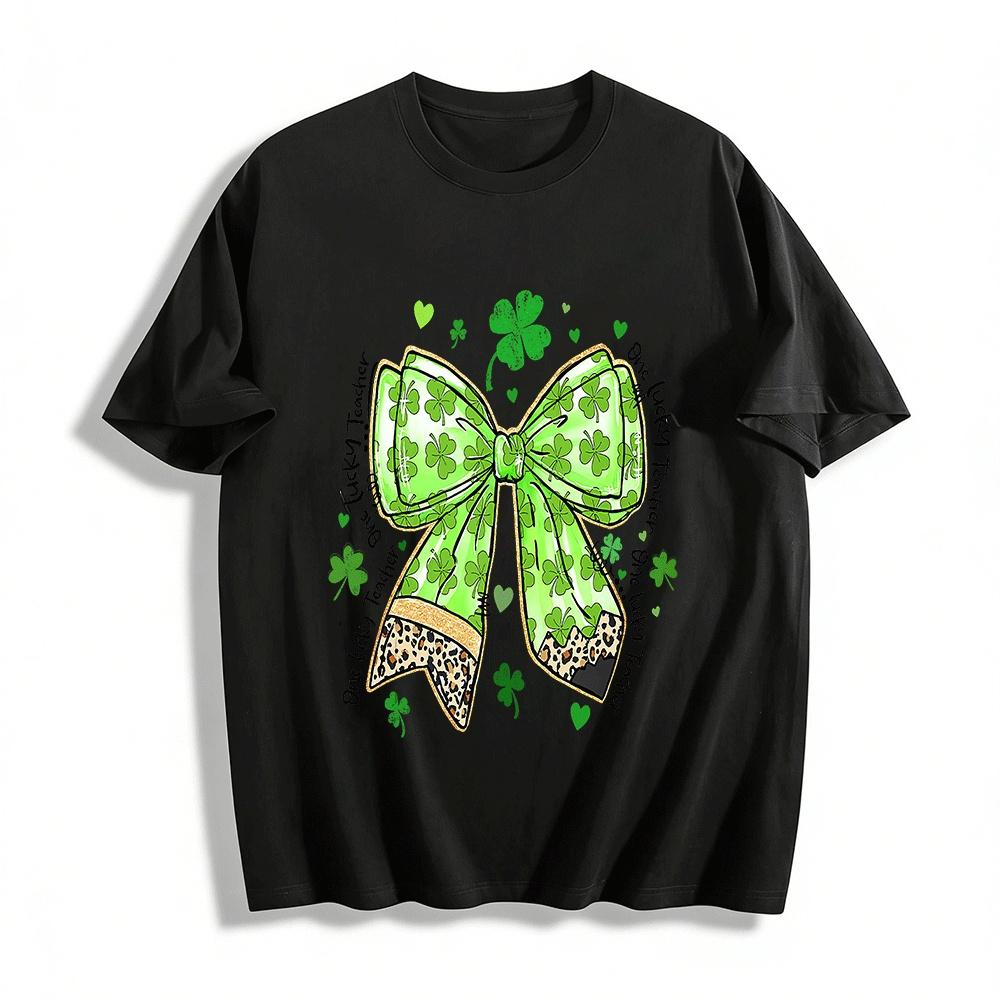 St Patricks Day Lucky Teacher Clover Leopard Bow Print Top Pure cotton T-shirt