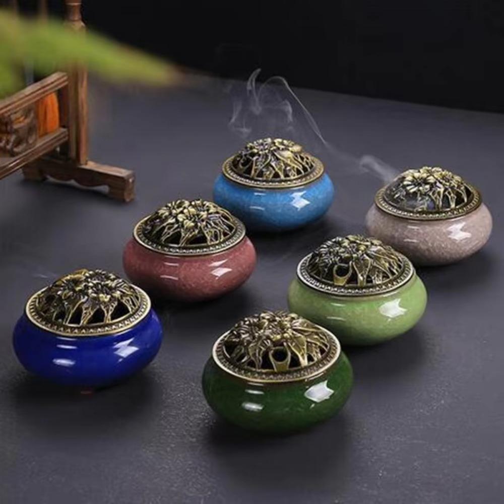 New Ceramic Incense Burner Copper Cover Ice Crack Incense Plate Antique Alloy Sandalwood Stove Home Decoration